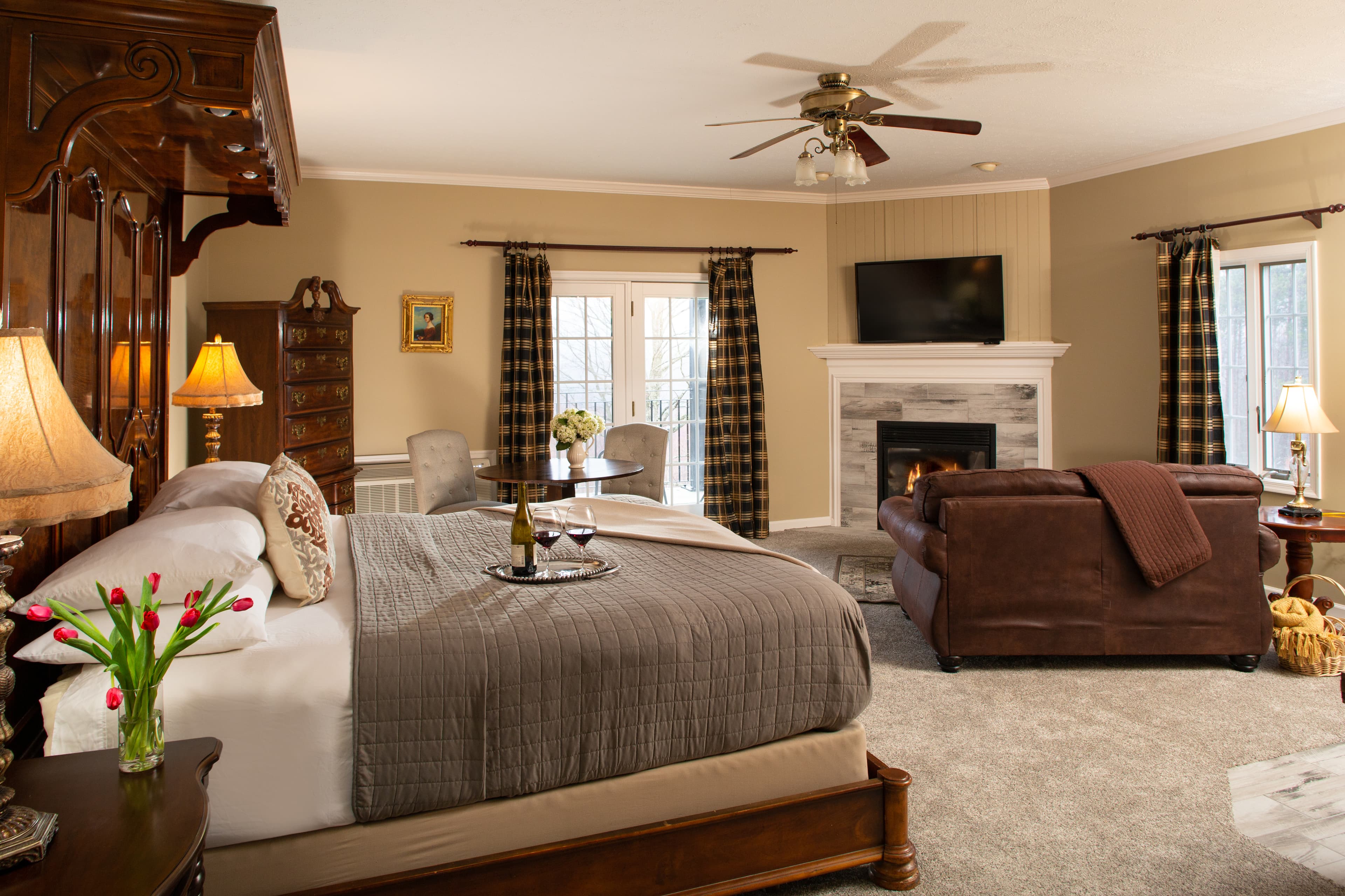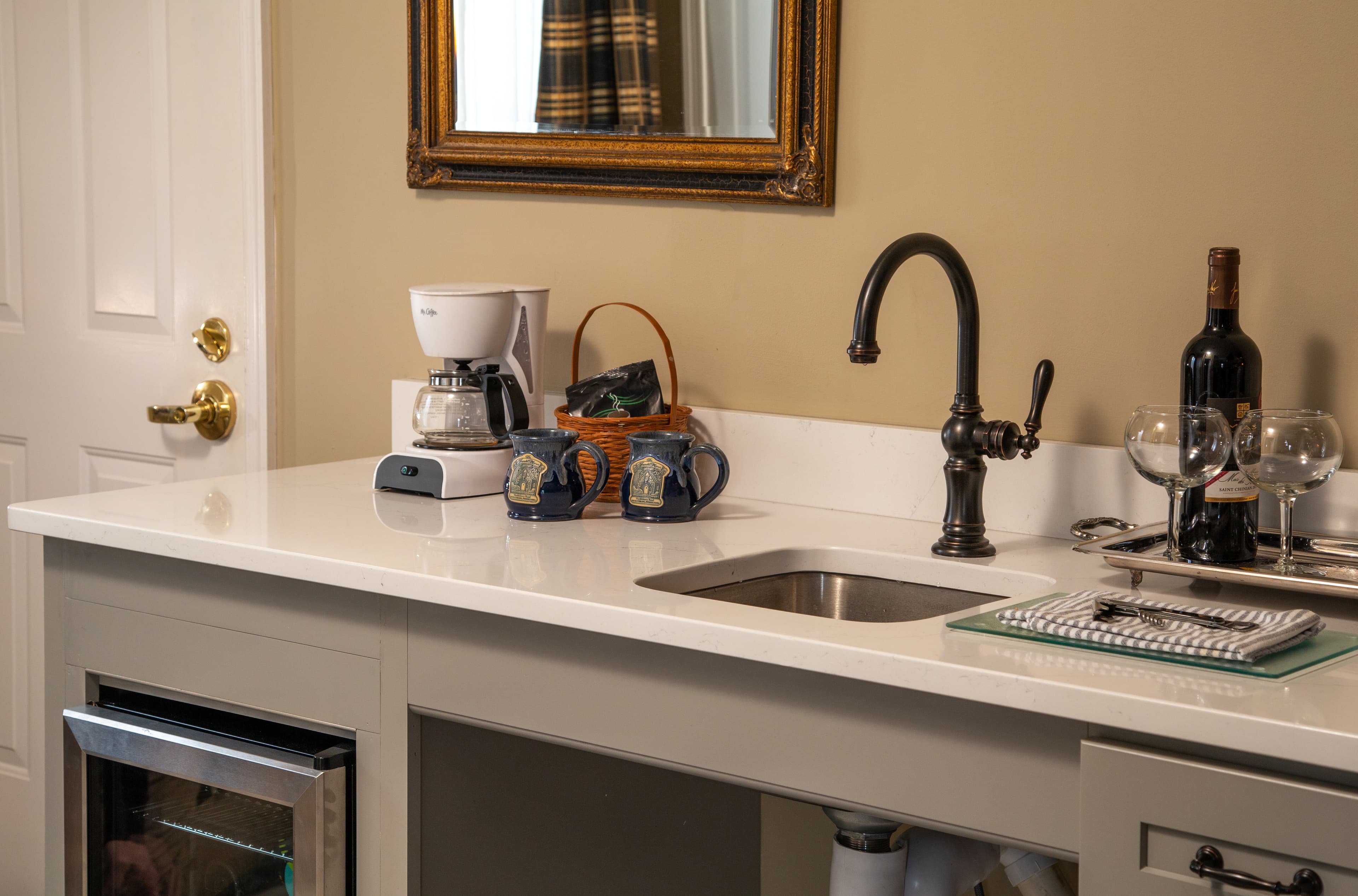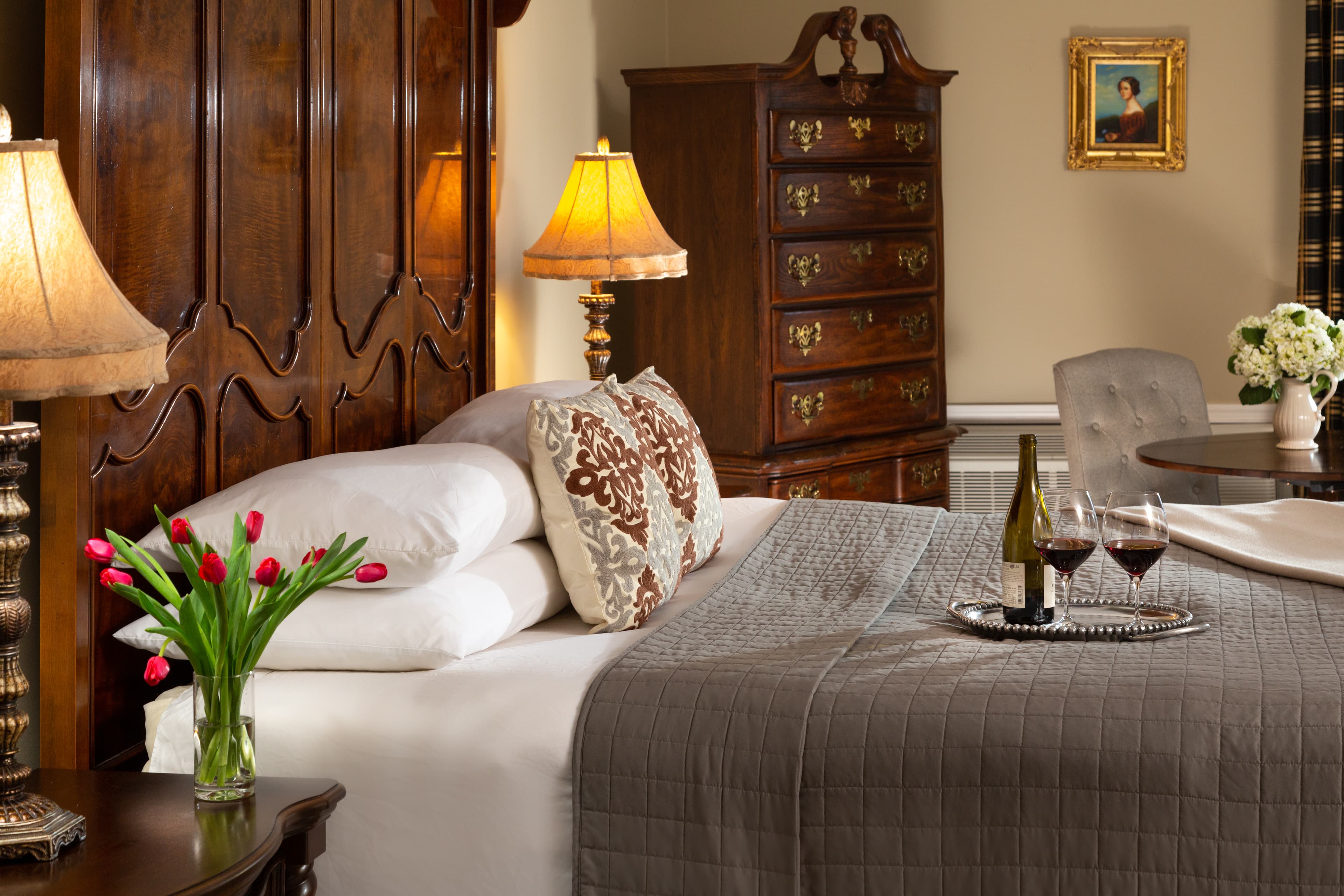 Located on the second floor of the Carriage House Building, this quiet and soothing room has a large queen sized bed, a private desk to connect to our wi-fi and attached bathroom. The private bathroom has a beautiful walk-in tiled shower and plush white robes. With its inset windows and curved walls to the ceiling, this room has a true European feel.