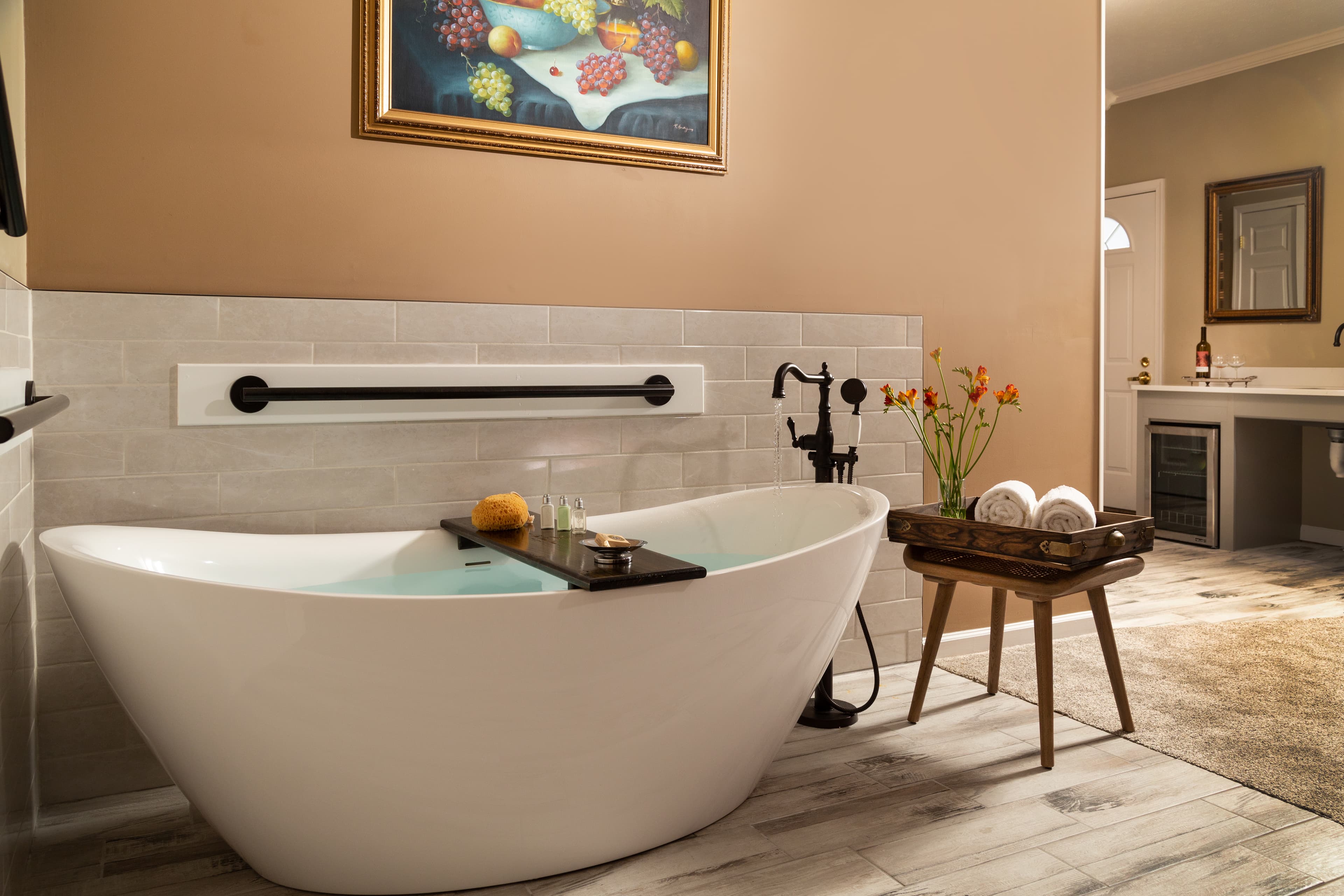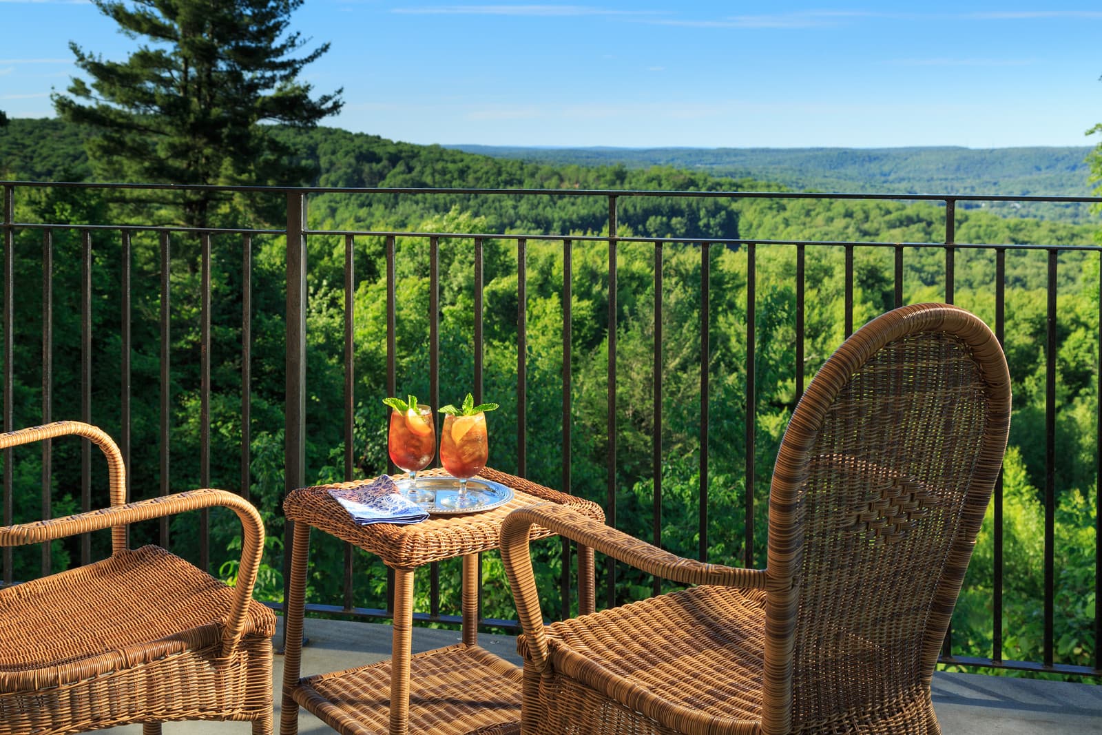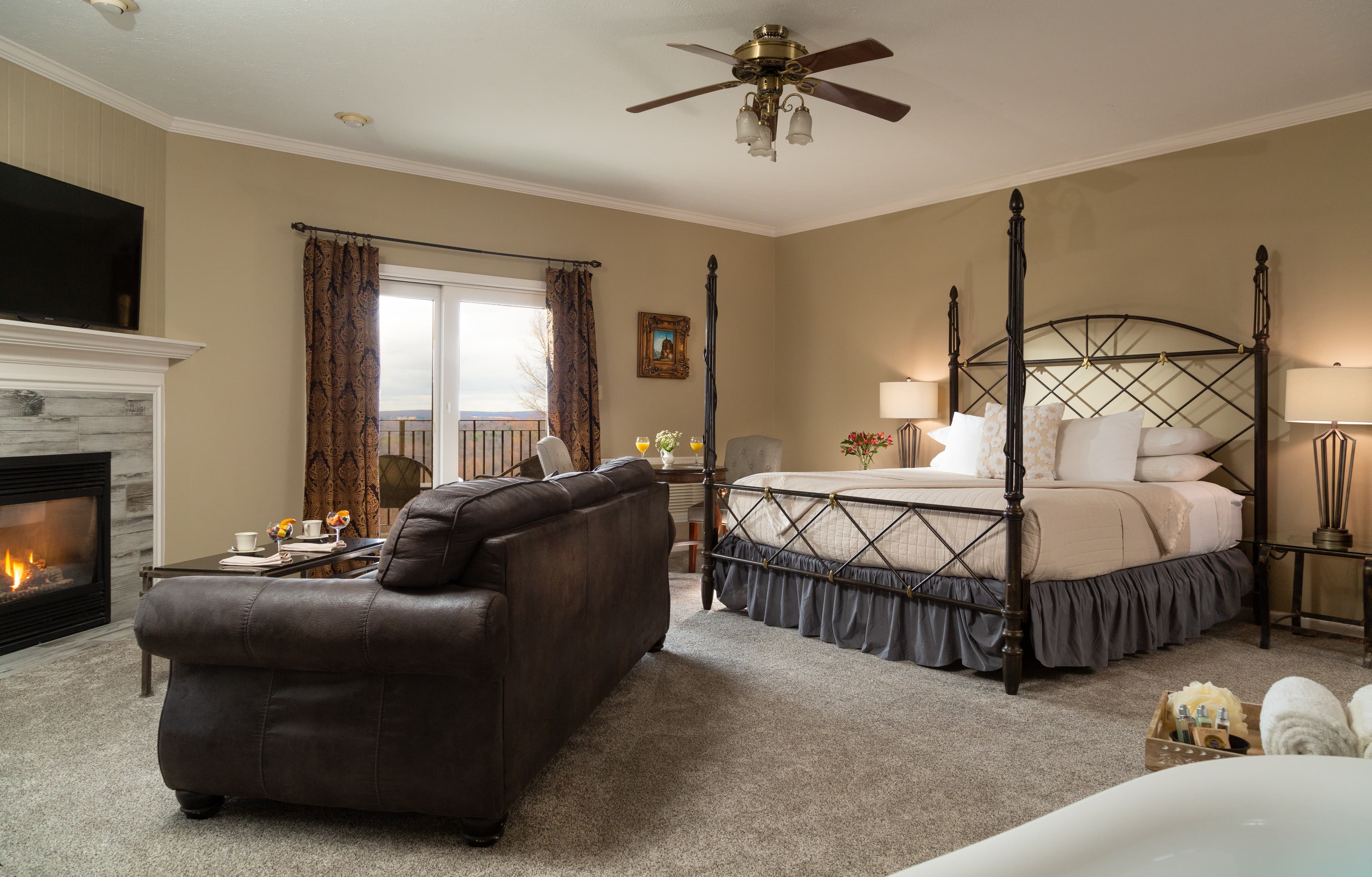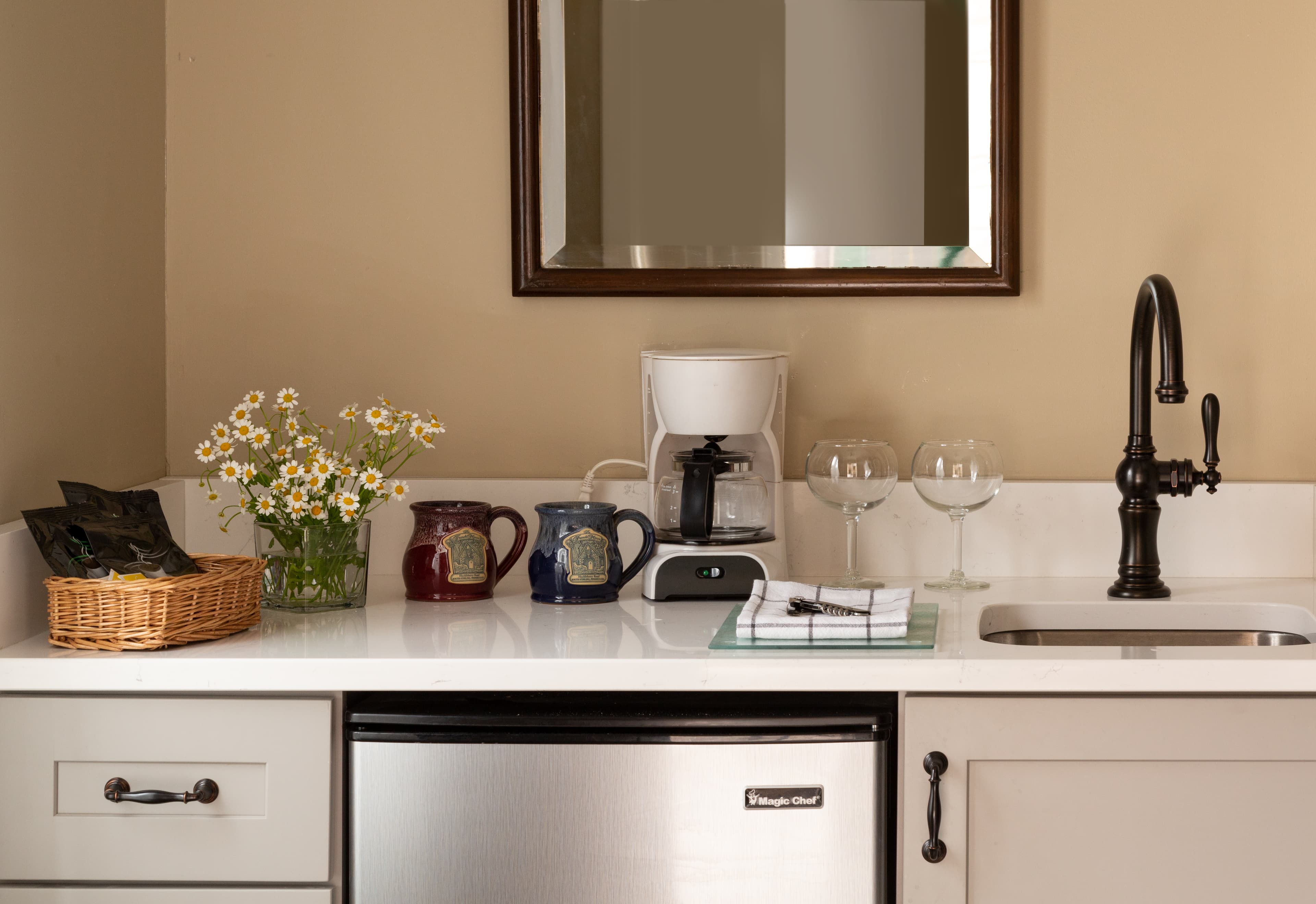 Located on the second floor of the Carriage House Building, this quiet and soothing room has a large queen sized bed, a private desk to connect to our wi-fi and attached bathroom. The private bathroom has a beautiful walk-in tiled shower and plush white robes. With its inset windows and curved walls to the ceiling, this room has a true European feel.