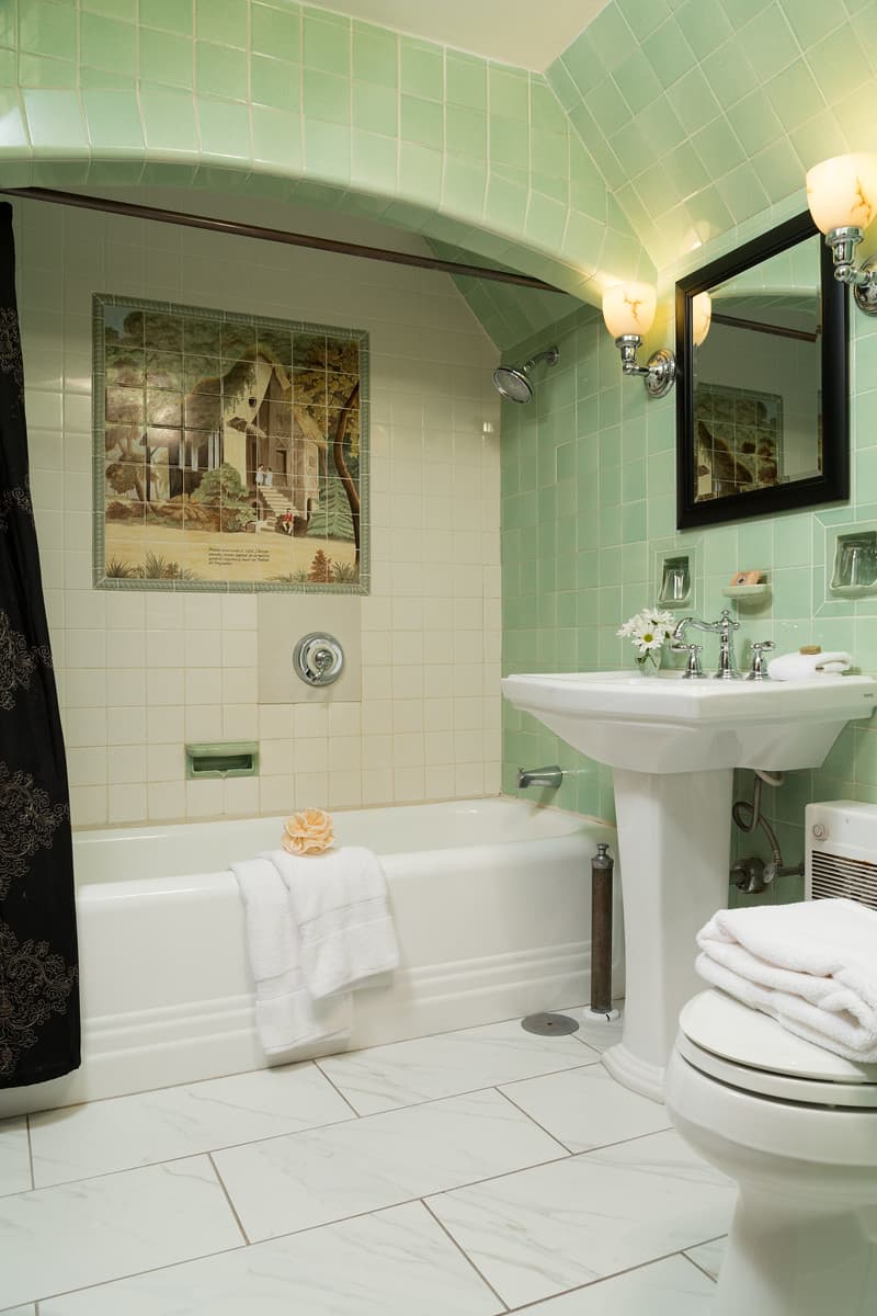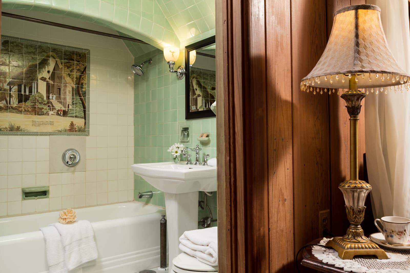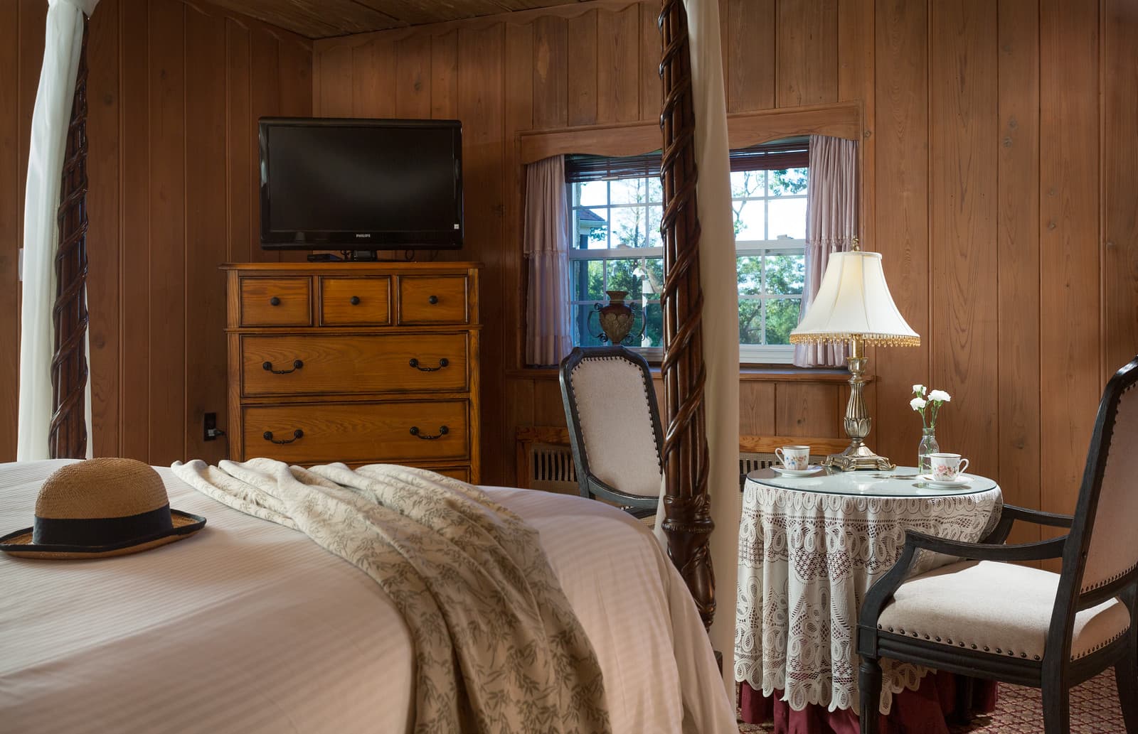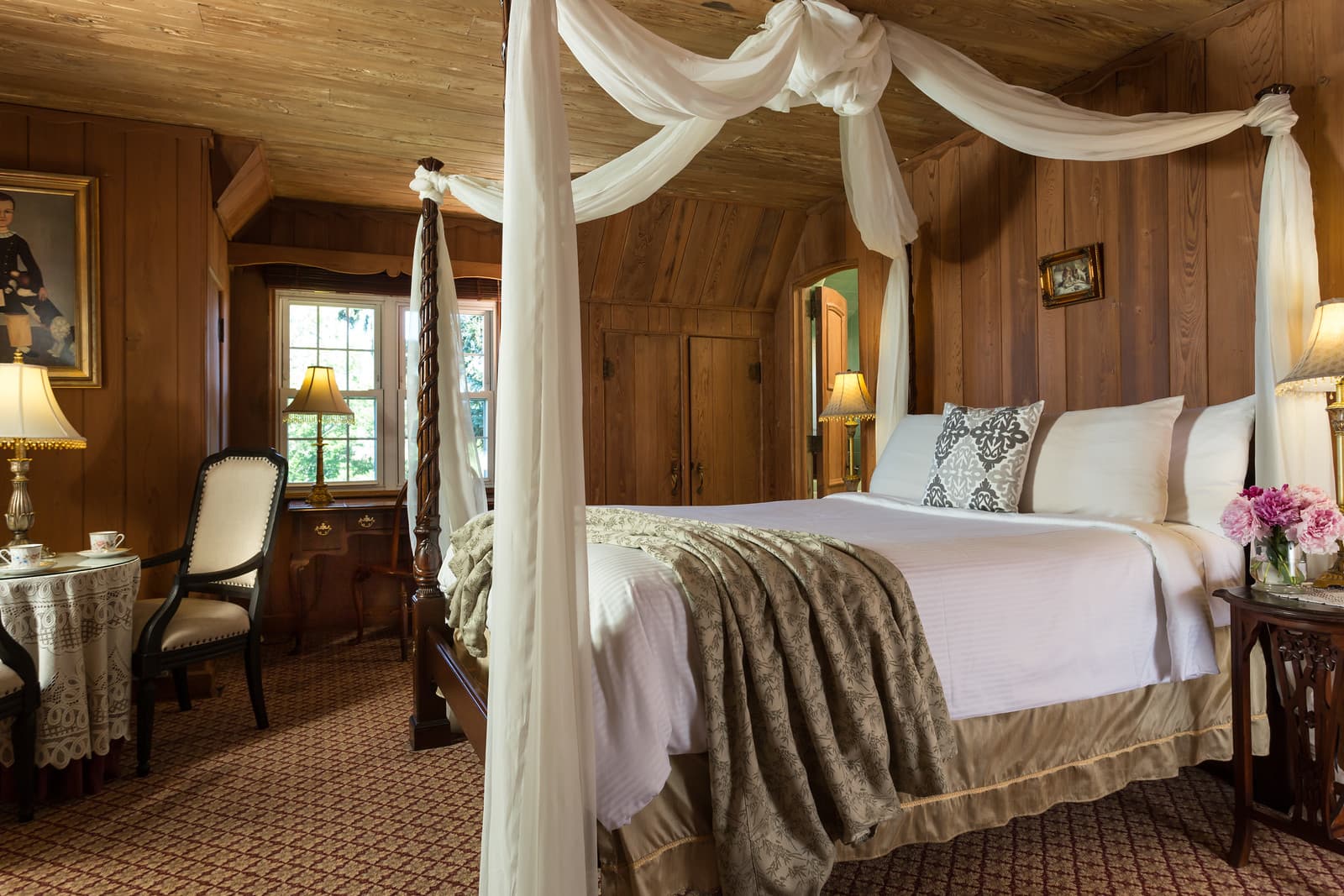 Located on the 2nd floor on the far end of the dining room with a private staircase to its entrance, Versailles boasts a carved, rope-twist, four-poster bed with elegant sheer draperies. This room has original tile work in the bathroom and a mountain view.