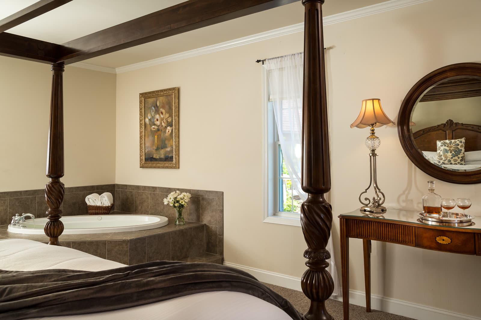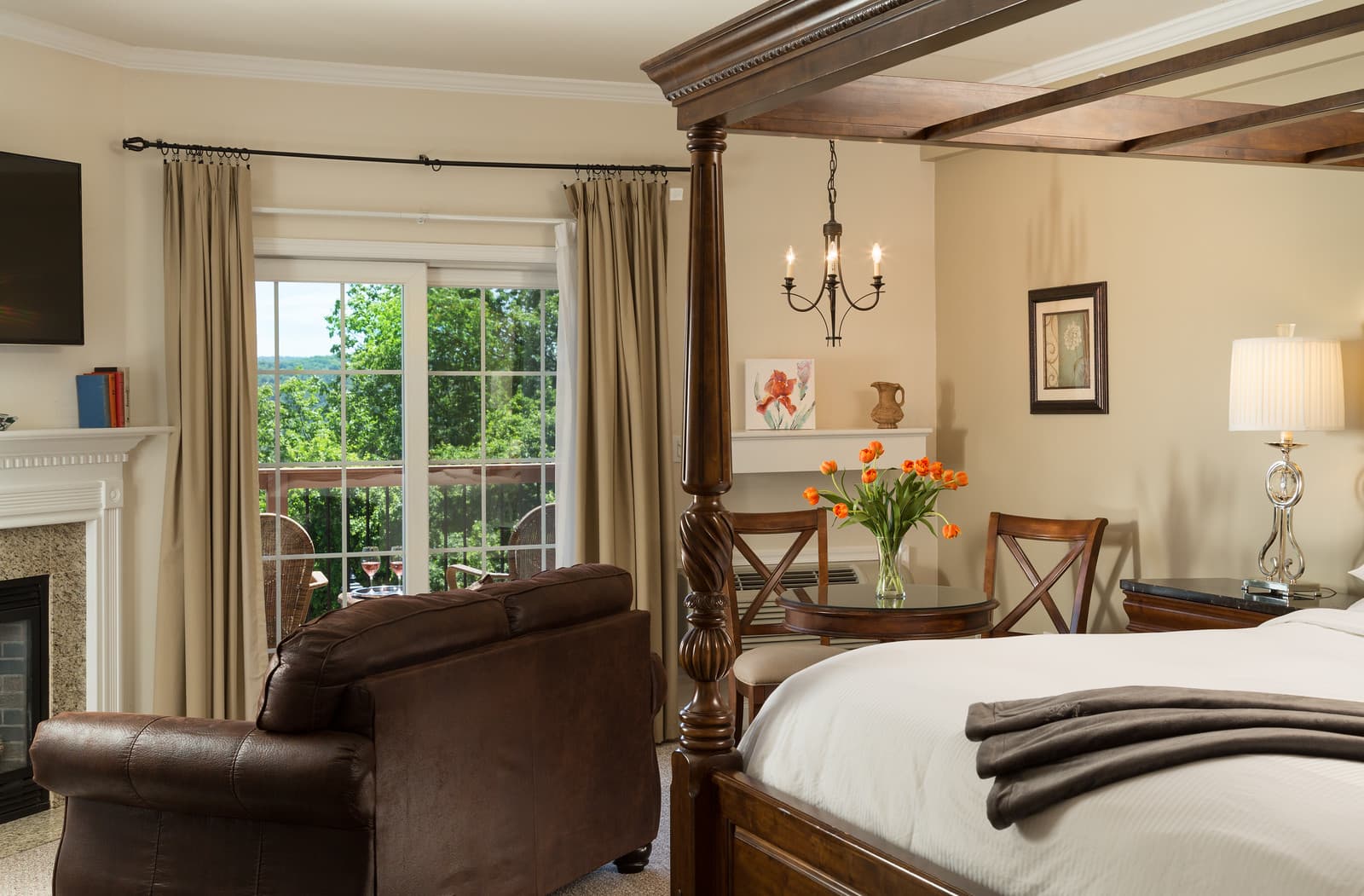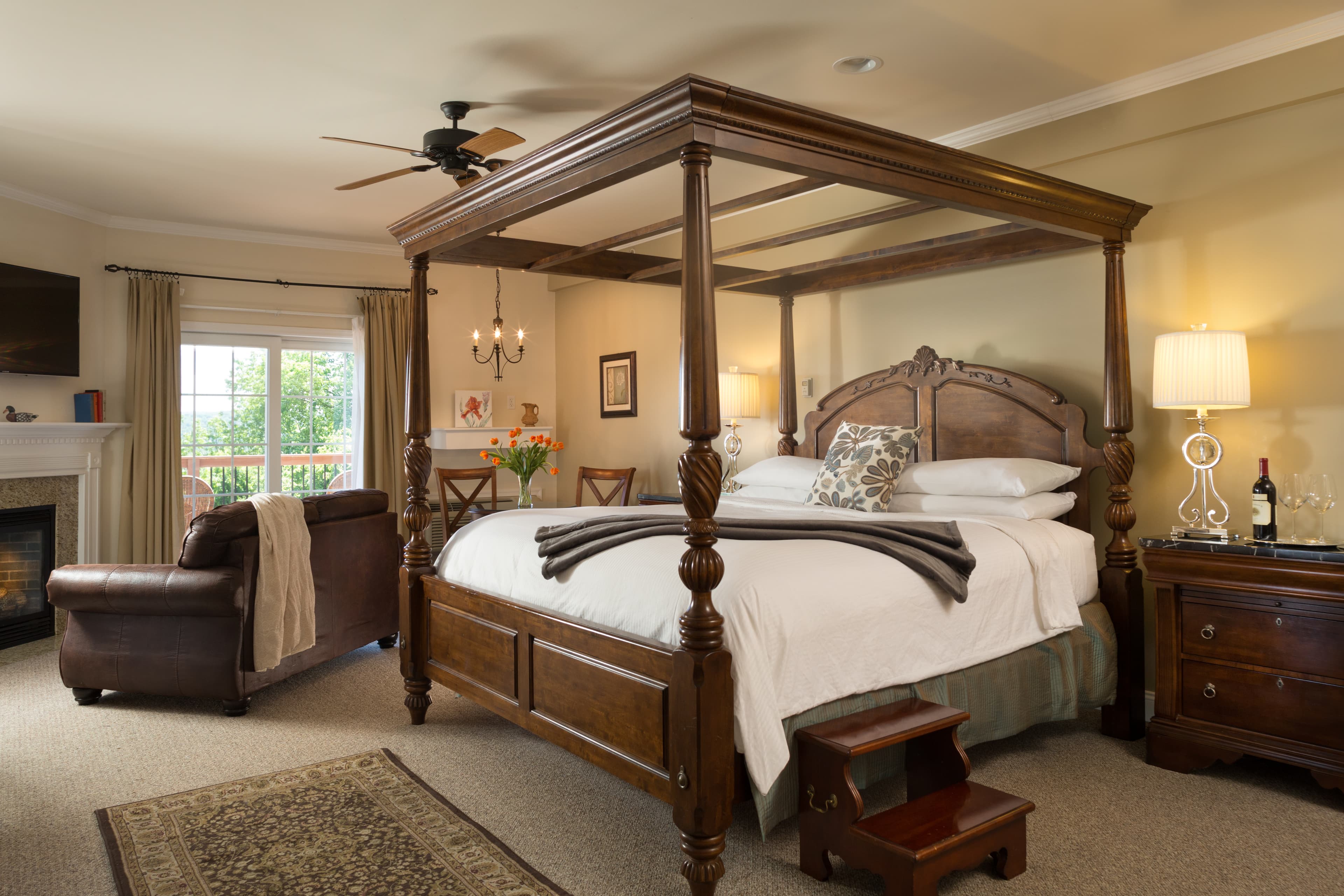 King Bed, fireplace and Whirlpool Tub are just the beginning of the amenities in this luxurious and elegant suite with private balconiy and inspiring views. The "Jardin" Suite features a romantic canopy style king bed. Located in our Le Spa Foret building adjacent to the main Manor building.
