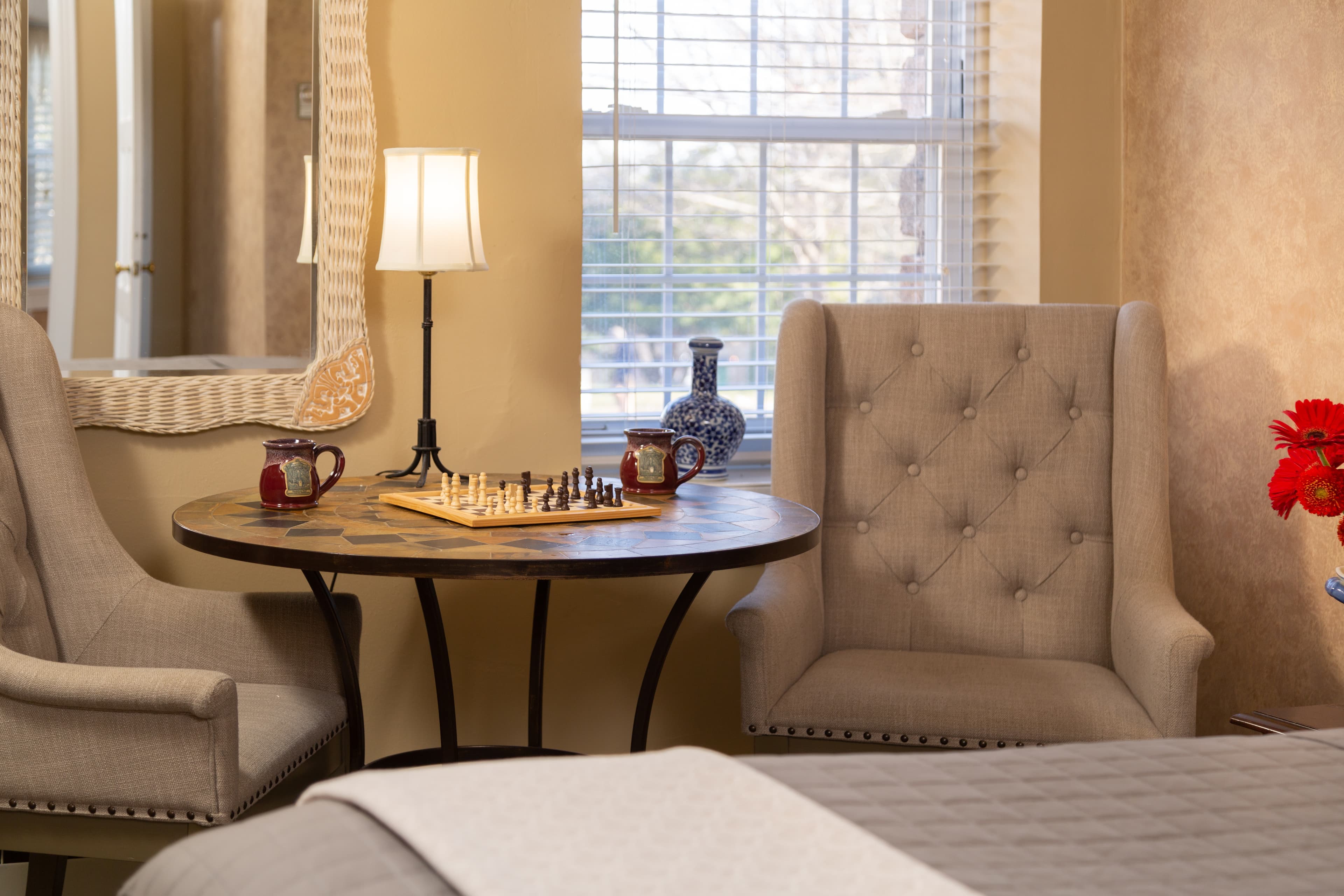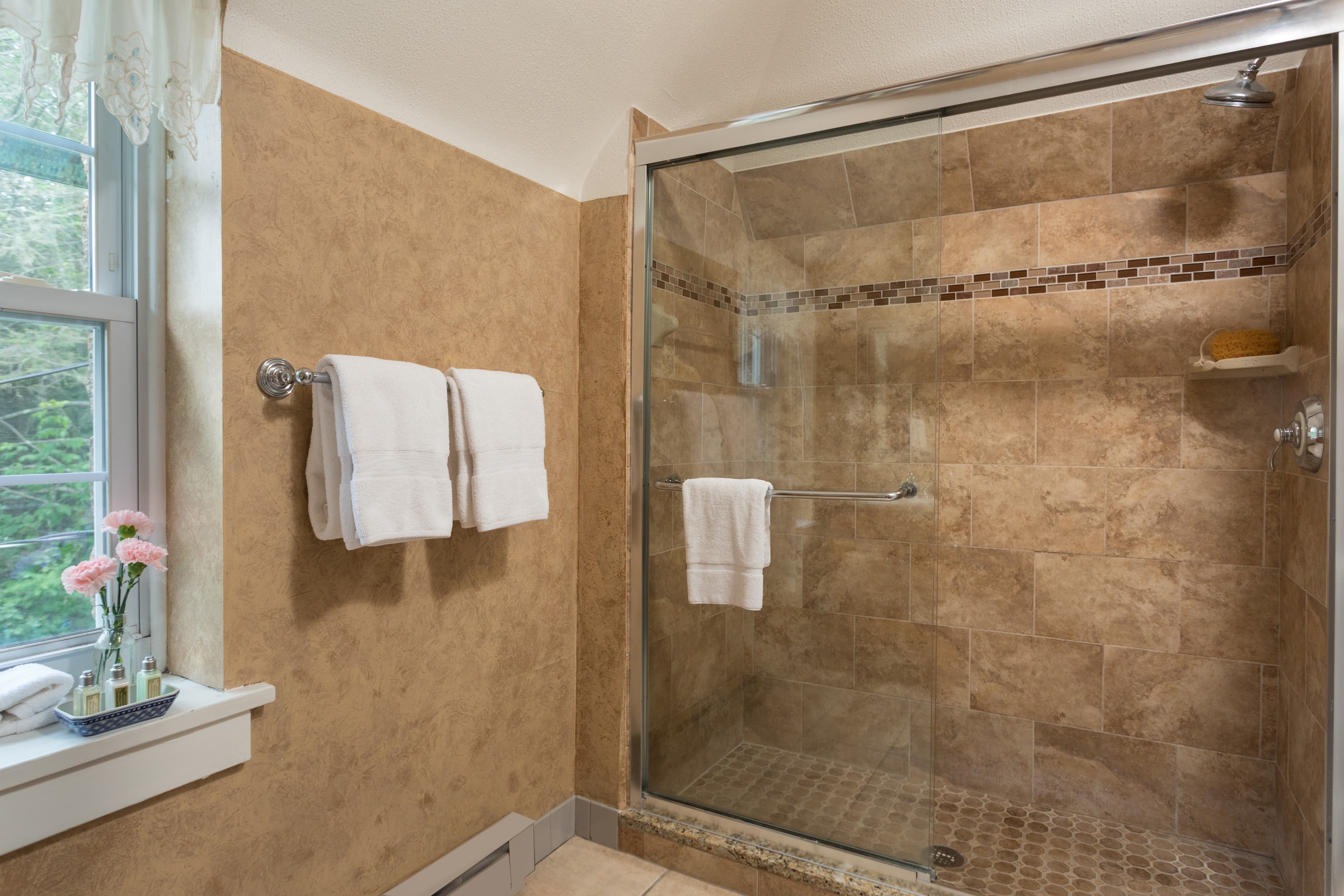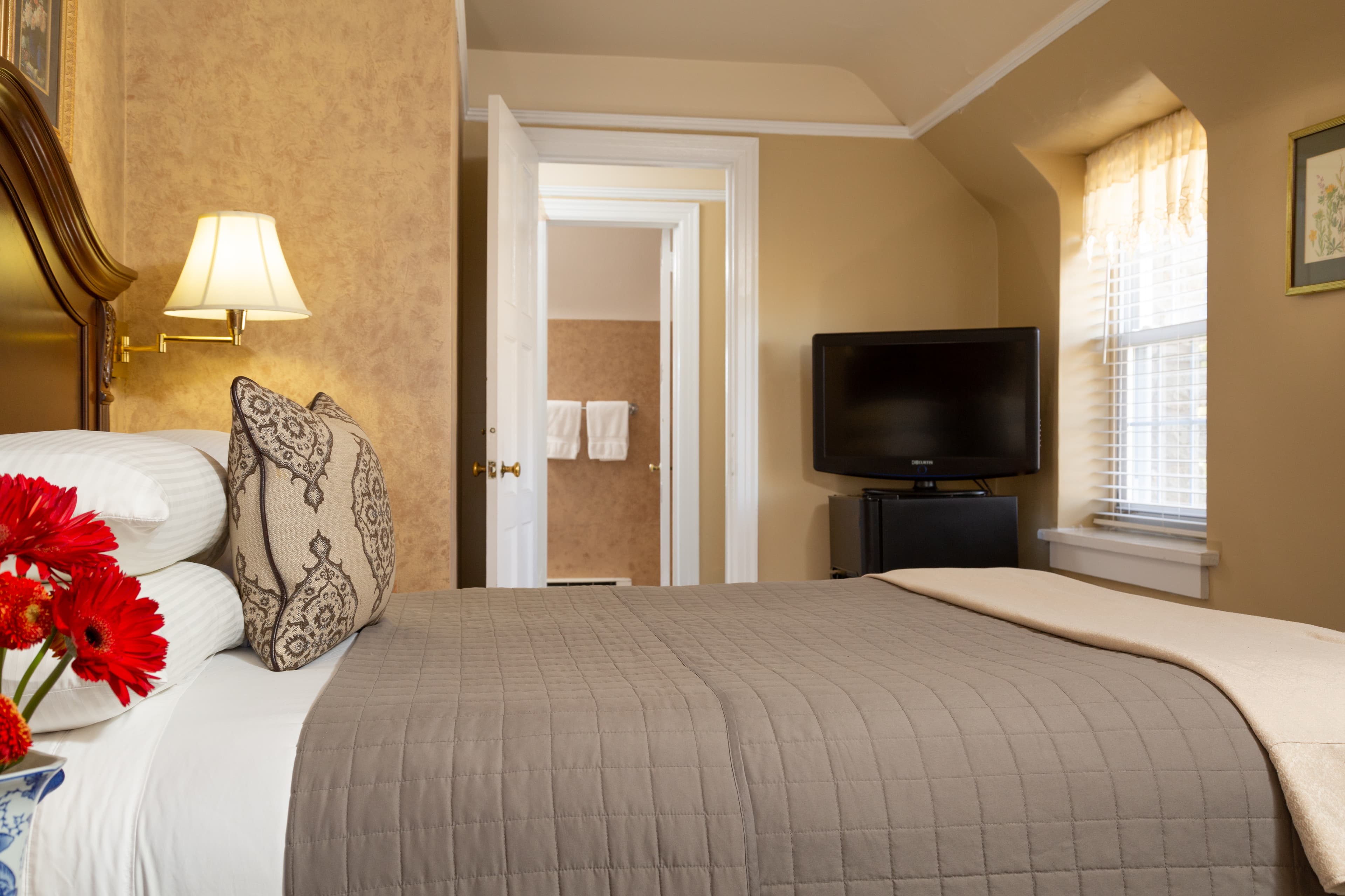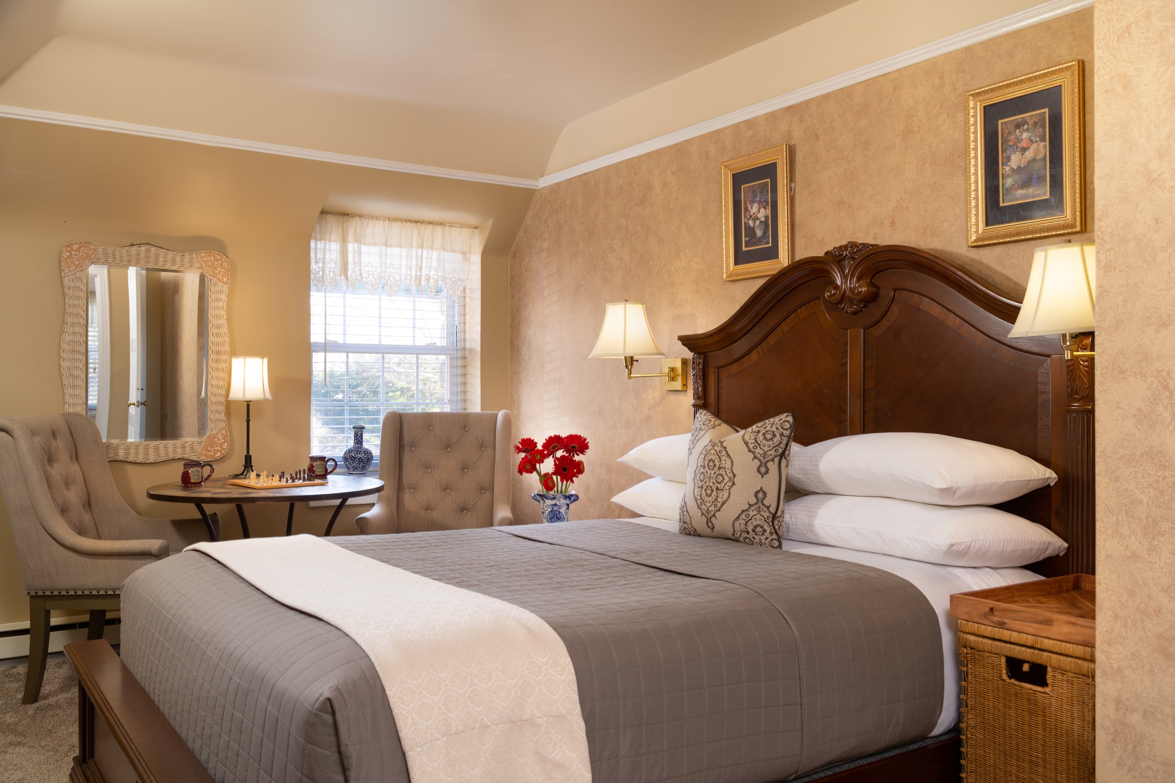 Located on the second floor of the Carriage House Building, this quiet and soothing room has a large queen sized bed, a private desk to connect to our wi-fi and attached bathroom. The private bathroom has a beautiful walk-in tiled shower and plush white robes. With its inset windows and curved walls to the ceiling, this room has a true European feel.