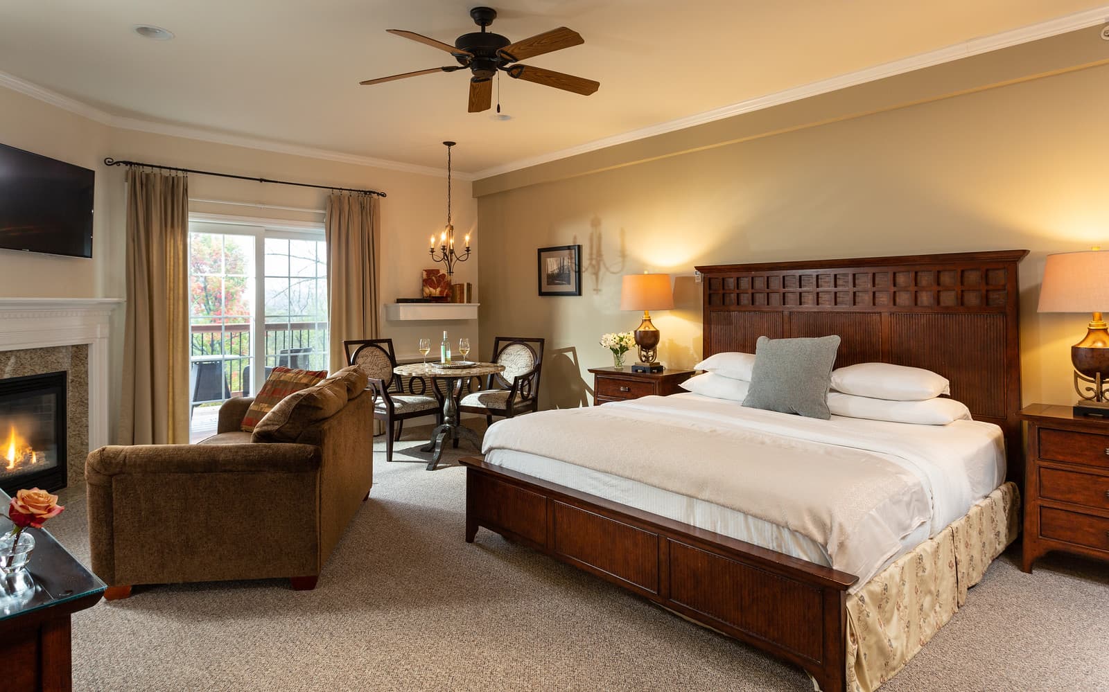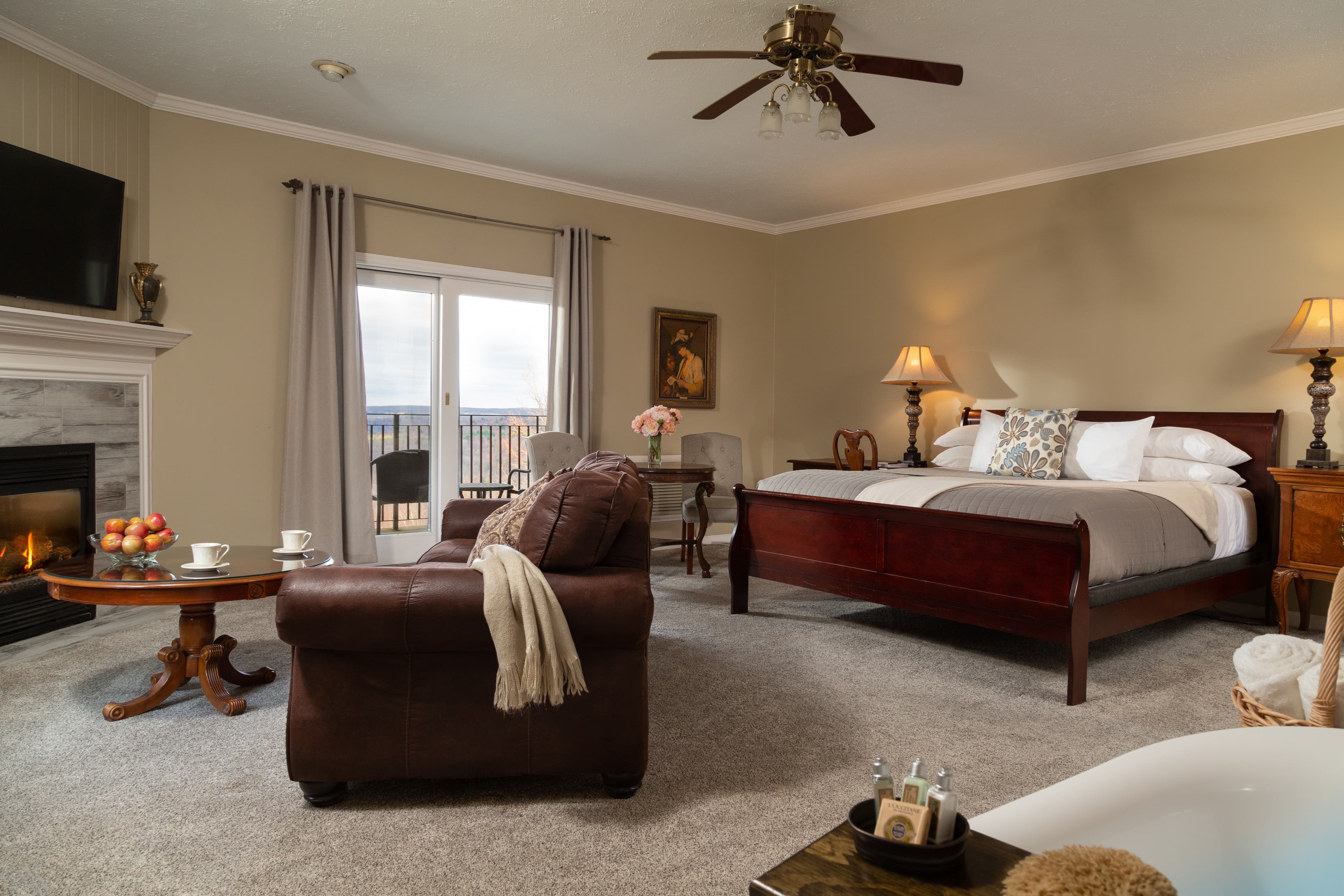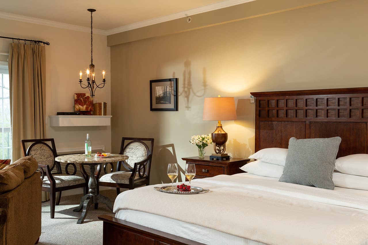 King Bed, fireplace and Whirlpool Tub are just the beginning of the amenities in this luxurious and elegant suite with private balcony and inspiring views. The "Sante" Suite features an Asian inspired decor, beautiful accents and bamboo style king bed. Located in our Le Spa Foret building adjacent to the main Manor building.