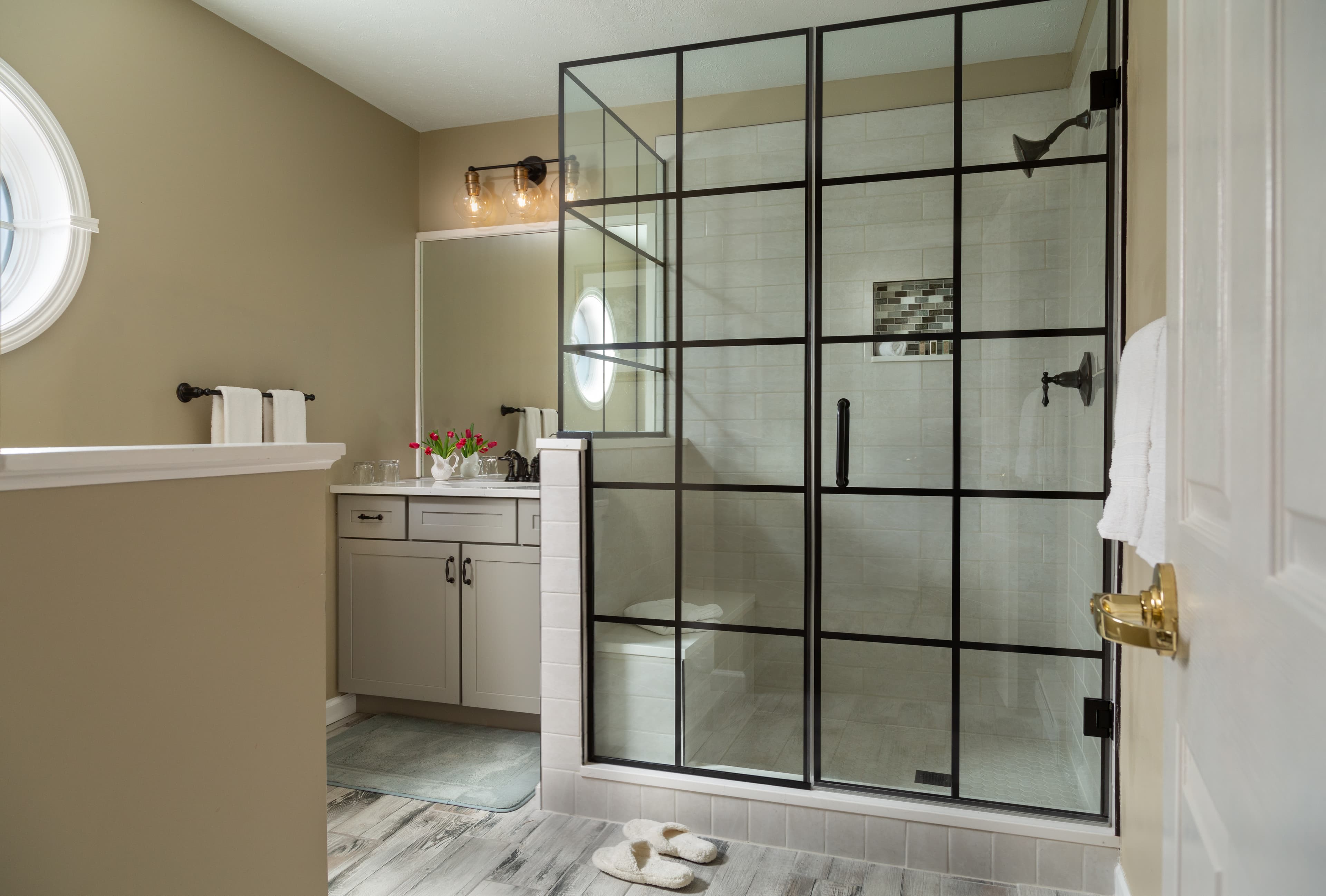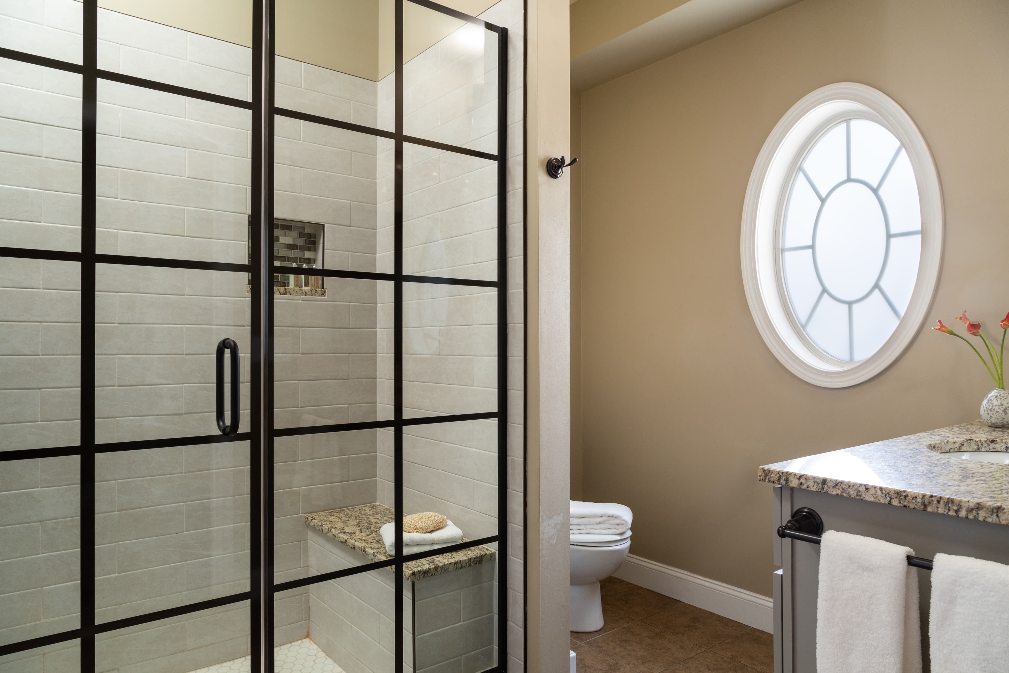 - Large Walk-in Tiled Shower with bench