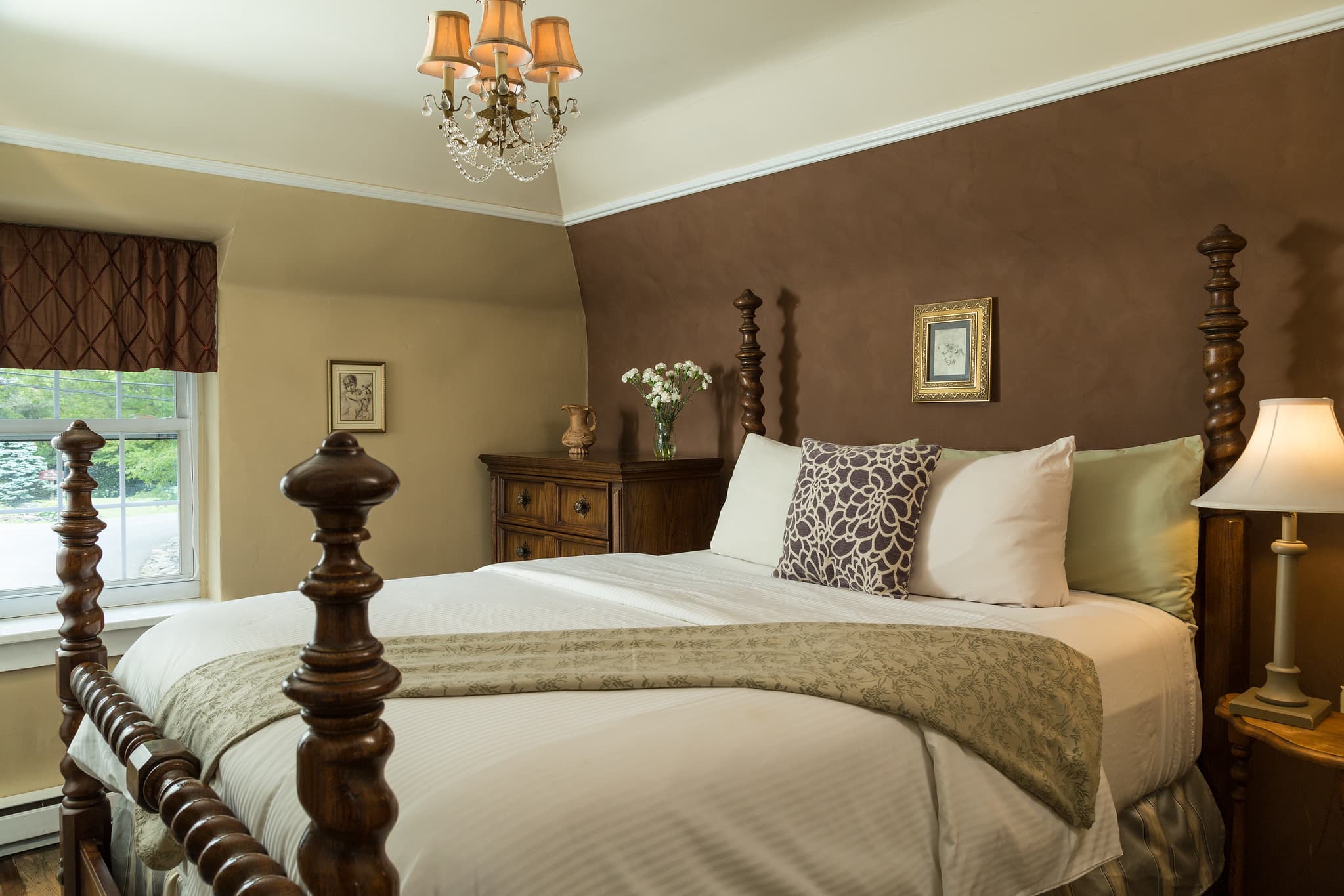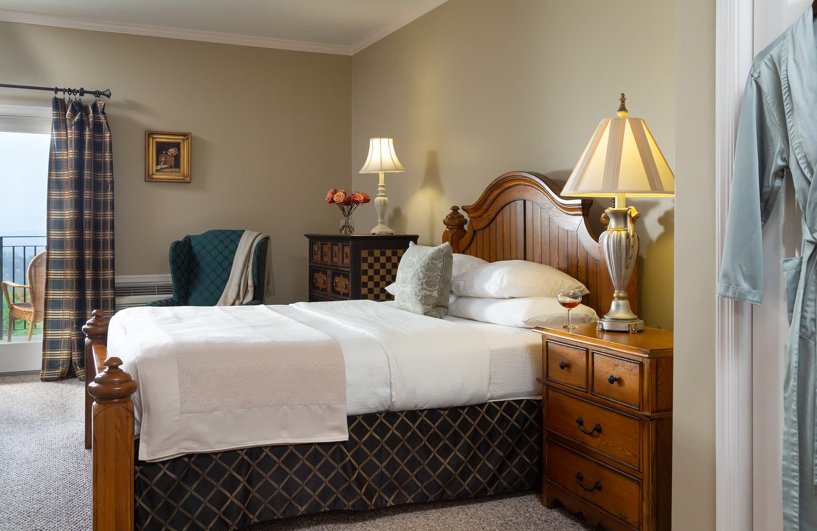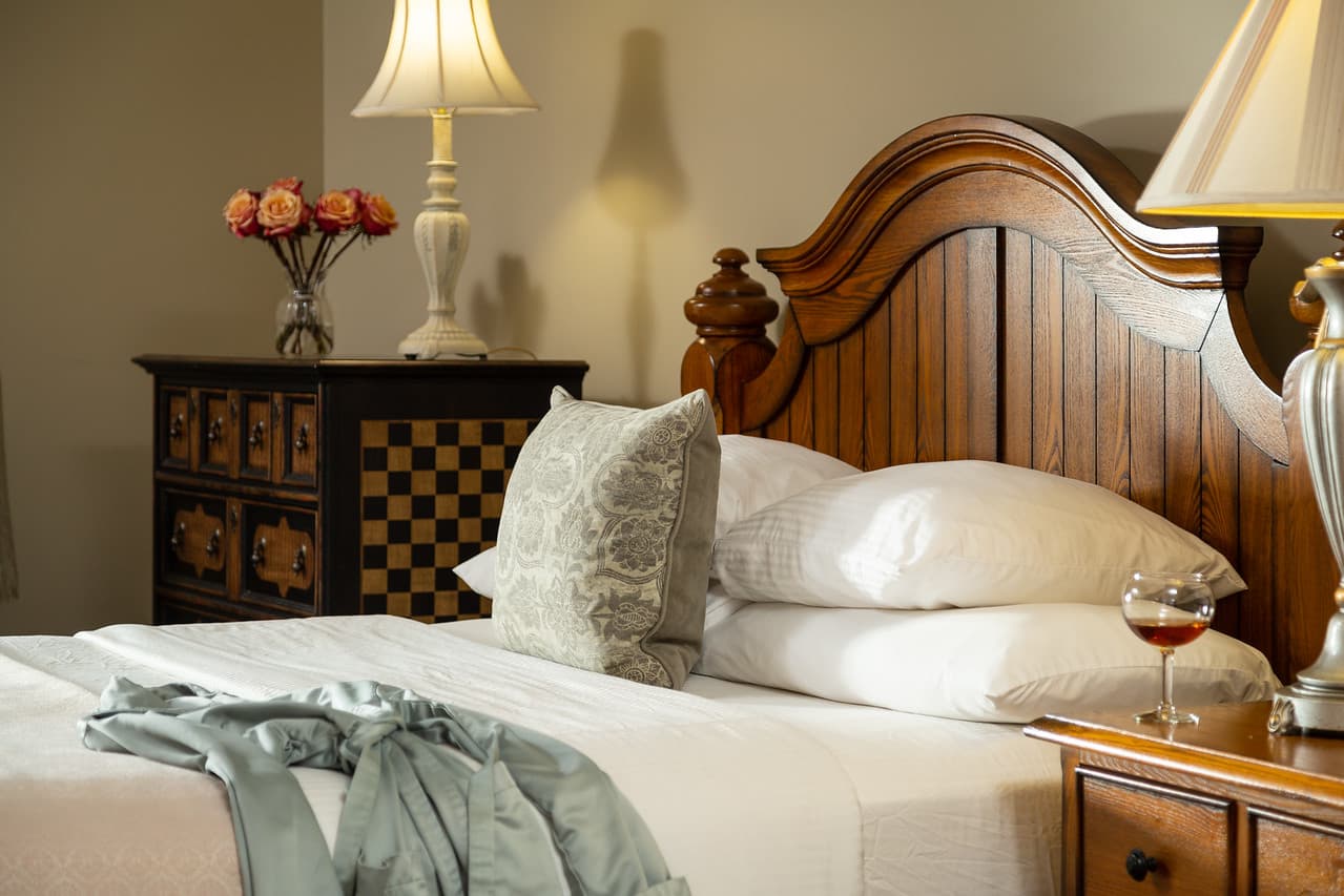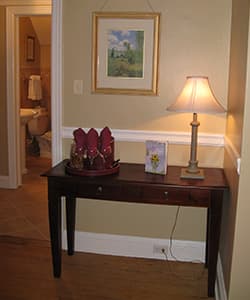 This large and tastefully decorated One-Bedroom suite will be your sanctuary away from home and work. Hardwood floors in the living room with fireplace, spa-like bathroom with shower room and 2 person Bubble Massage Whirlpool Tub, Kitchenette with bistro table (perfect for room service), Queen Bed in the Bedroom with a Single Daybed in the Living Room. Located in the Carriage House on the second floor.
