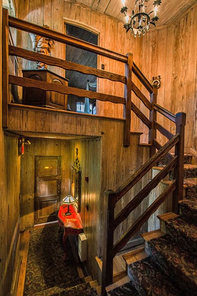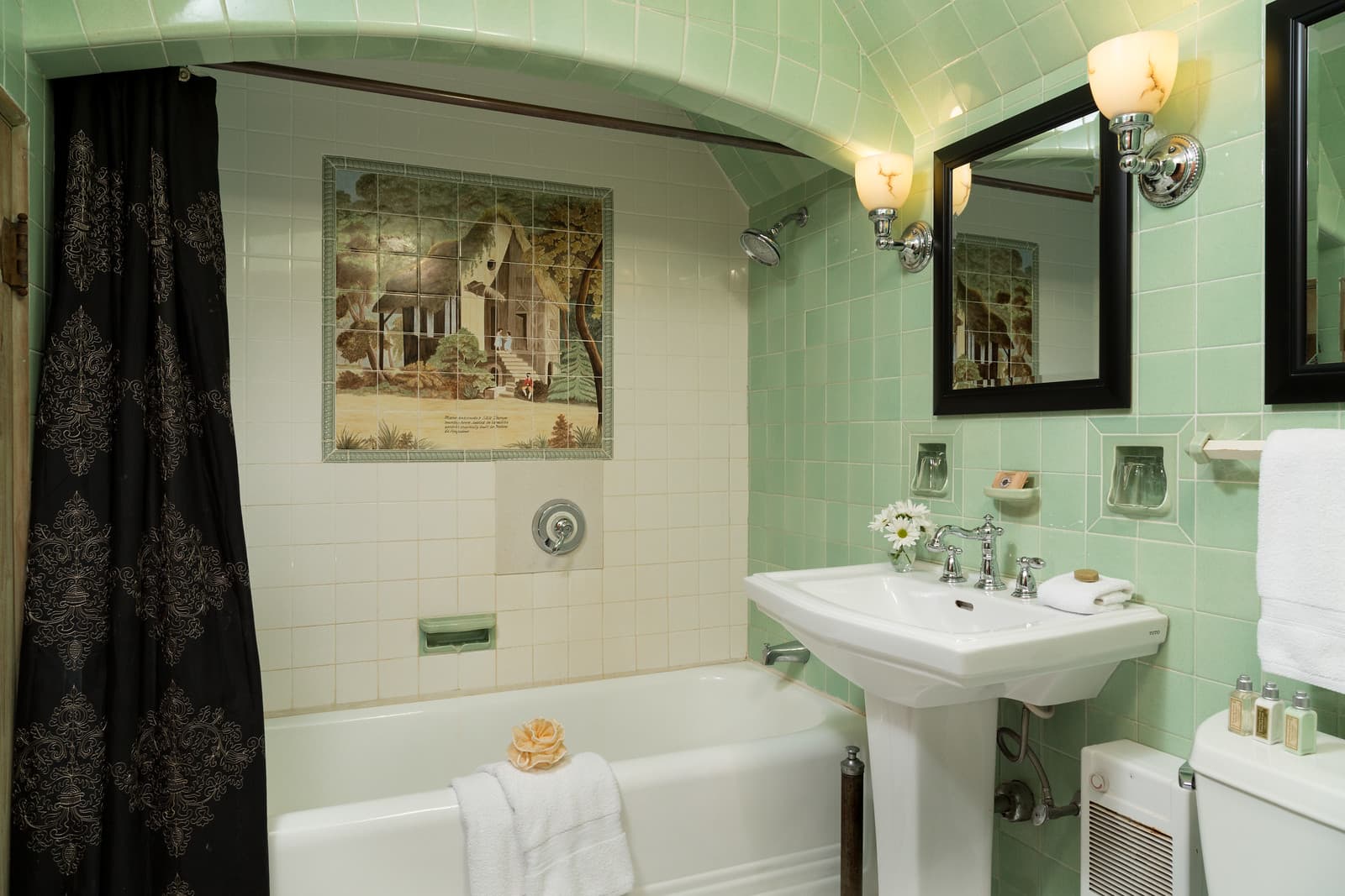 Located on the 2nd floor on the far end of the dining room with a private staircase to its entrance, Versailles boasts a carved, rope-twist, four-poster bed with elegant sheer draperies. This room has original tile work in the bathroom and a mountain view.